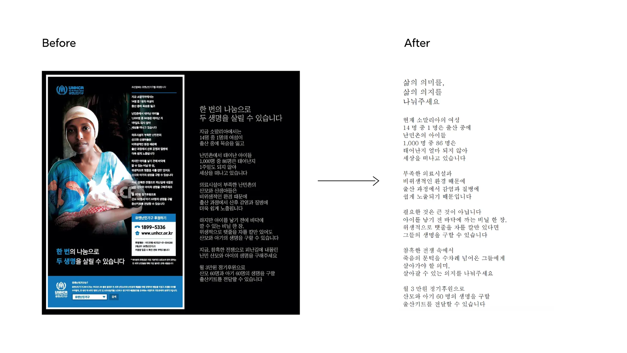 유엔난민기구 기존 광고 카피 워싱